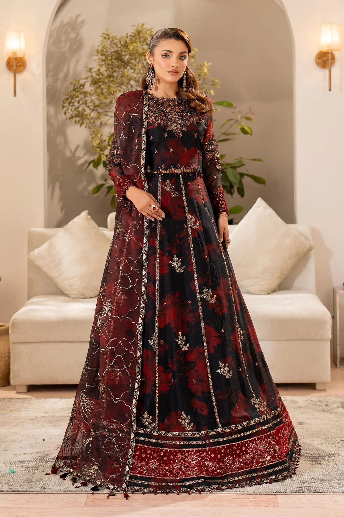 A striking black and red printed flowy lehnga choli, intricately embellished with silver threadwork and sequins, paired with a richly embroidered chiffon dupatta and dyed raw silk trousers. This ensemble radiates regal elegance with a touch of sophistication — an ideal choice for night-time weddings.
