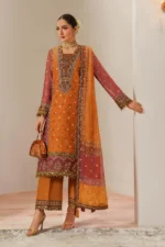 A deep orange ensemble featuring a fully embroidered shirt with contrasting threadwork and detailing. Paired with wide-legged trouser with detailed border and a printed chiffon dupatta adorned with accents. This look captures the essence of festive splendor and classic sophistication.