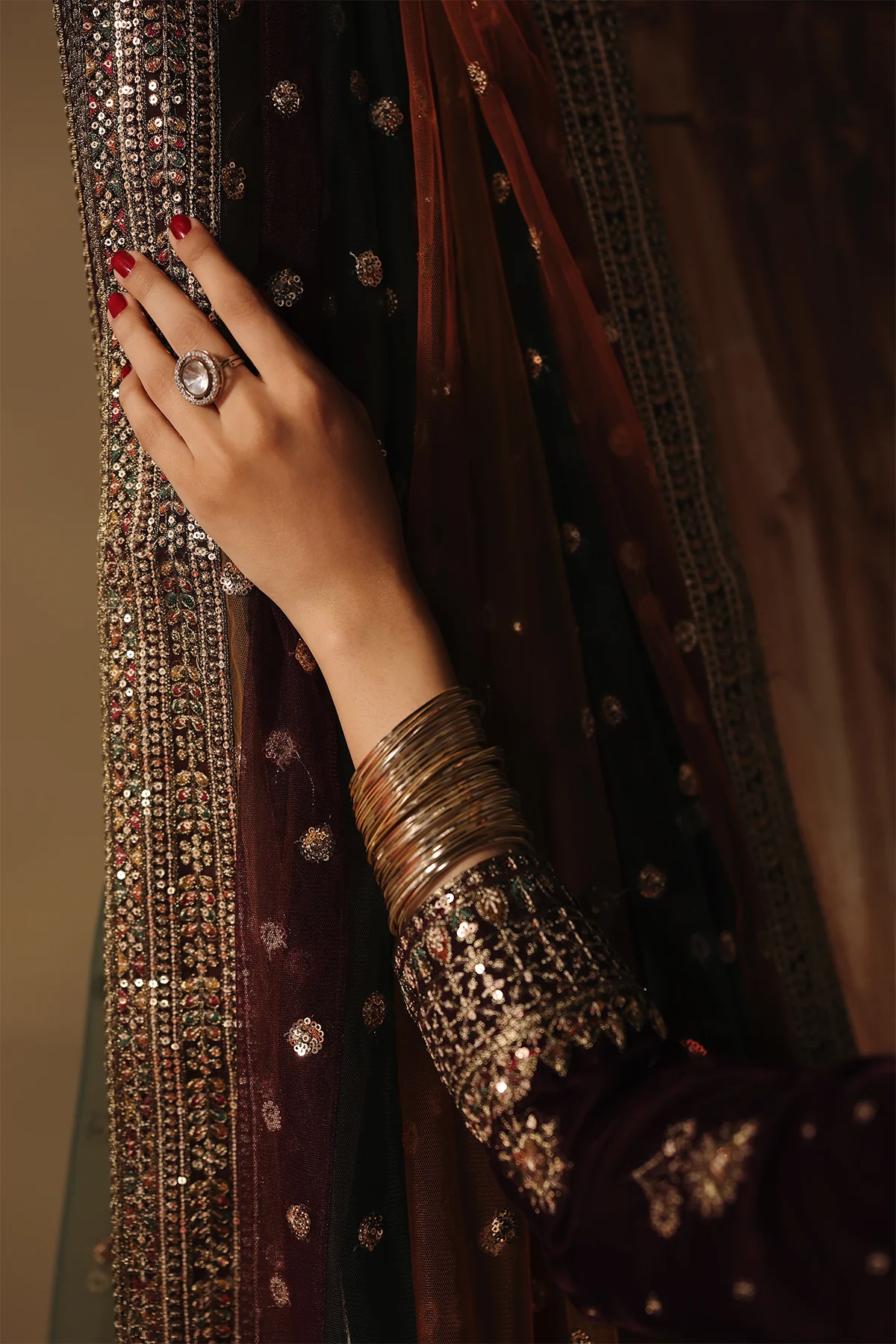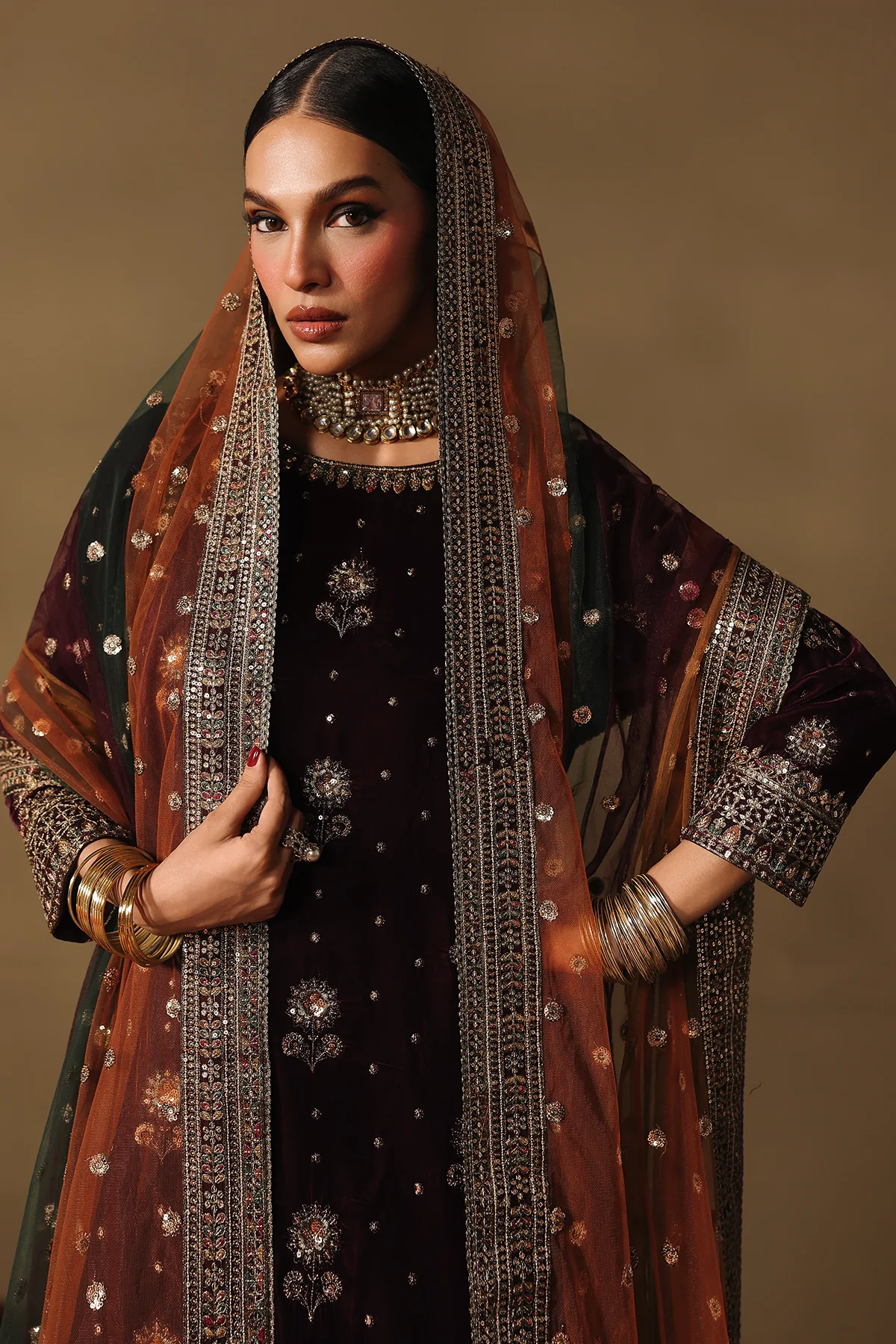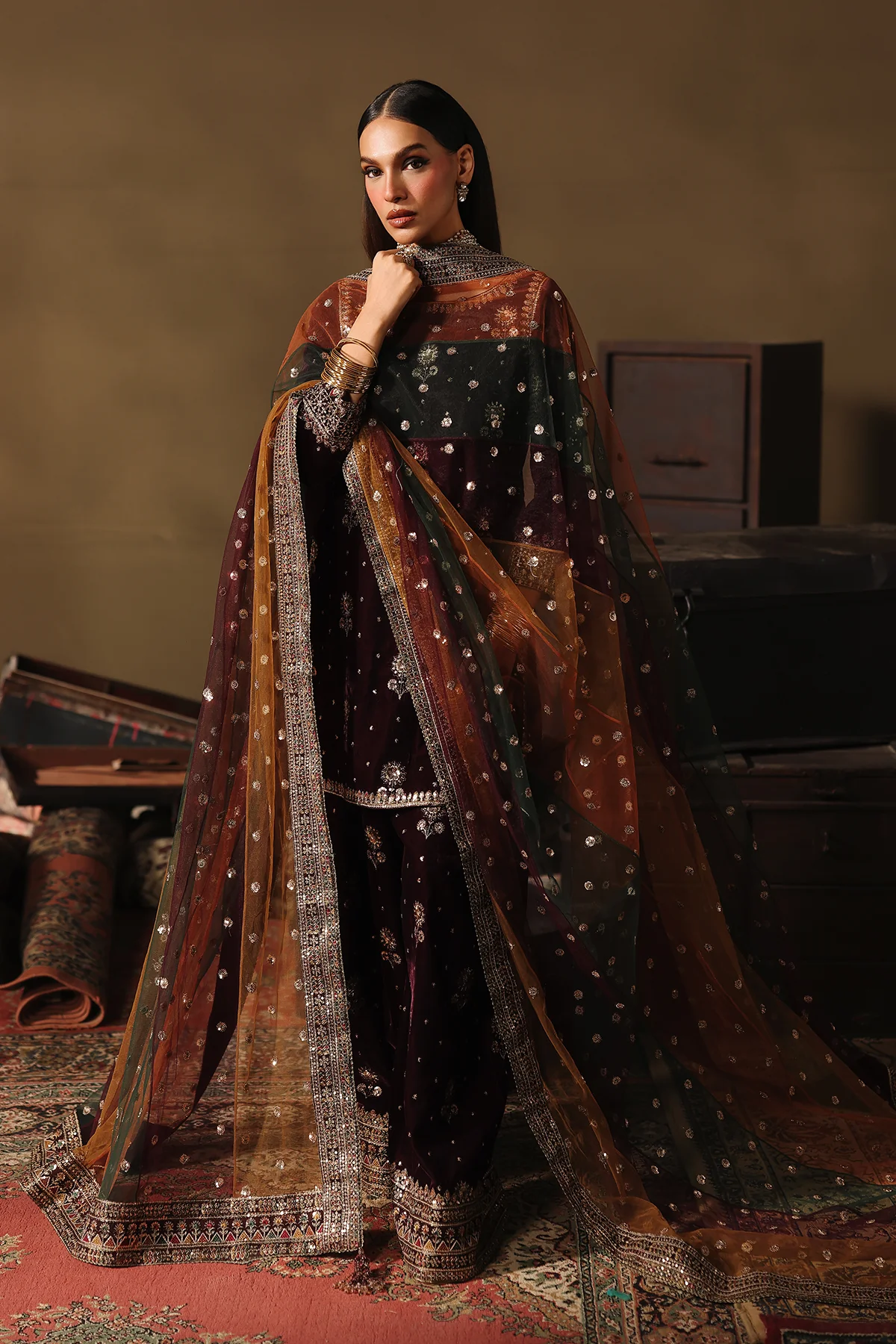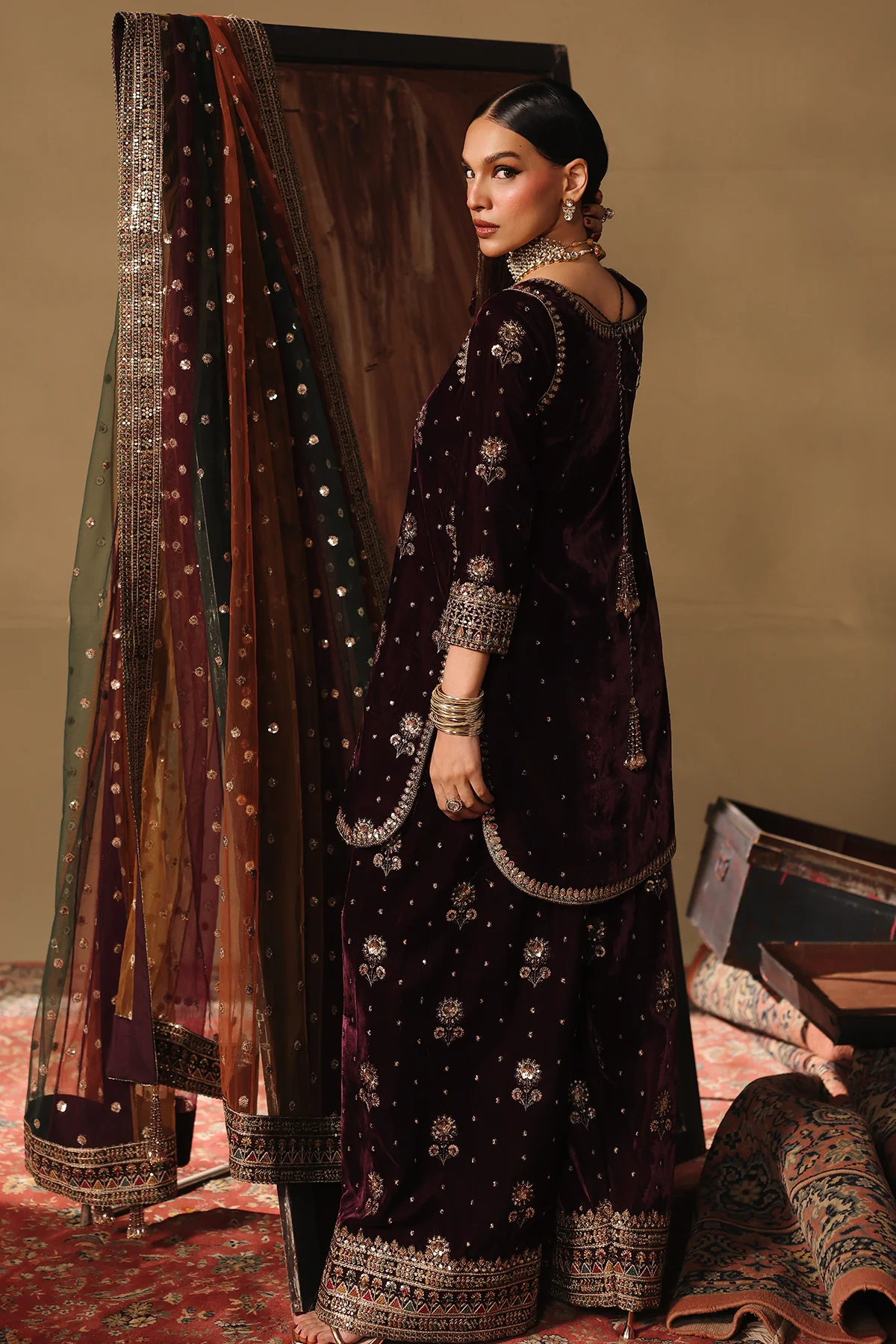 Rendered on a rich wine velvet base, this elegant ensemble is embellished with finely placed traditional motifs executed in sequin and resham embroidery.