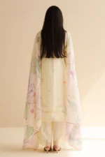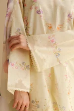 A soft yellow-toned shirt with delicate flower patterns, matched with minimal trousers and a painterly dupatta for a breezy, feminine vibe.