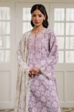 Introducing the Lavender Muse 3PC Embroidered Lawn Suit, a sophisticated ensemble designed for the discerning wearer. The shirt features exquisite printed lawn across the front, back, and sleeves, complemented by delicate embroidery adorning the neckline and two decorative patches at the hem. The sleeves are finished with 60 inches of ornate embroidered patti for refined detailing. Paired with a flowing chiffon printed dupatta that adds elegance and versatility, and completed with a comfortable cambric dyed trouser in a coordinating shade. This three-piece collection exemplifies traditional craftsmanship with contemporary appeal, perfect for both casual gatherings and special occasions.