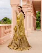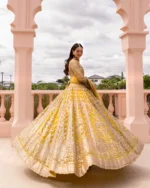 Embracing the grandeur of festive occasions, Melita is a spectacular floor grazing silhouette crafted in an exuberant yellow hue. The net pishwas is delicately adorned with the unique artistry of resham and tilla stitches arranged in dainty floral trellises. Paired with a silk churidaar and an elaborately embroidered sheer net dupatta, this piece showcases superior artisanal skill and impeccable quality, making it a versatile piece you will cherish for years.