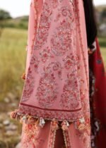 A vision of refined elegance, this long pastel pink embroidered shirt features a delicate neckline spray flowing gracefully across its panels, complemented by bold paisley motifs on heavily composed sleeves and an intricately embroidered hem. The look is completed with culottes enhanced with motif and border detailing, paired beautifully with a contrast rust floral printed wool shawl finished with printed facings — creating the perfect harmony of softness, warmth, and timeless sophistication.