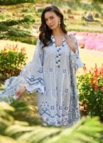Rendered in a serene blue tone, this unstitched pure cotton lawn shirt features intricately arranged geometric and floral motifs that create a rhythmic, all-over fabric pattern. The design is anchored with contrasting ornamental borders, adding definition and visual interest without overwhelming the base. Paired with a pure cotton cambric trouser and a flowing chiffon dupatta detailed with complementary prints, the ensemble offers a light, breathable feel with a composed and decorative fabric story suitable for summer wear.