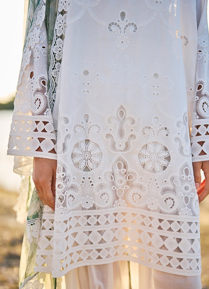 This unstitched pure cotton lawn shirt is presented in a crisp white base, adorned with intricate, lace-inspired floral and geometric motifs that create a rich yet airy fabric design. The pattern is thoughtfully placed to form a harmonious all-over composition, complemented by detailed borders that enhance texture and visual interest. Paired with a pure cotton cambric trouser and a softly printed chiffon dupatta, the ensemble feels light, breathable, and timeless. Ideal for elegant summer dressing with a clean, refined aesthetic.