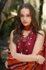 Elevate your style with our bold and rich new design. This particular design features schiffli front on solid color for a striking look, finished with a beautiful colored floral border. Paired with a constrasting stripes digital printed chiffon dupatta for a bold and standout look. This ensemble is perfect for making statement
