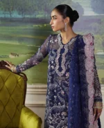 Stella dazzles in a majestic navy blue hue, adorned with intricate sequins waves that sparkle with every movement. A soft pink satin hem border adds a touch of vibrancy. The dupatta features embroidery in soft pink, coral, and lime shades, elegantly complemented by sparkling diamantes spray for added opulence, addition to it is a satin four sides border that make it culminating in a look that exudes timeless elegance and make it.