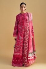 The embroidered trousers echo the detailing of the kurta, adding depth and cohesion to the ensemble. Draped over it, the luxury chiffon dupatta features a symphony of rich patterns-traditional cross-stitch elements softened by contemporary design, finished with a fine embroidered border that elevates its regal calm.